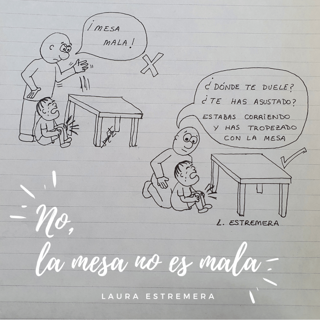 Si ante un choque como el de la imagen superior, ponemos el locus de control externamente, responsabilizando a la mesa ¿qué creencias desarrollará el niño?, ¿cómo percibirá la relación entre lo que le sucede y su acción?
