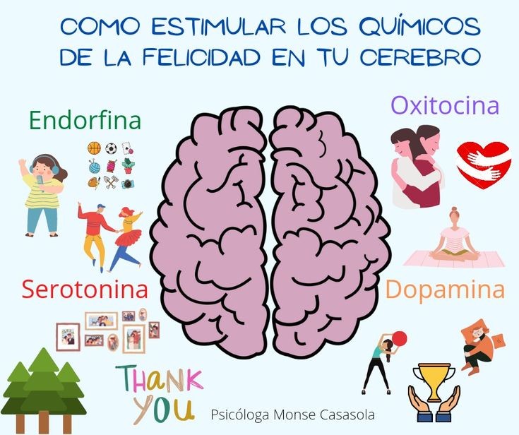 Algunos ejemplos de estos químicos del cerebro relacionados con la felicidad incluyen: