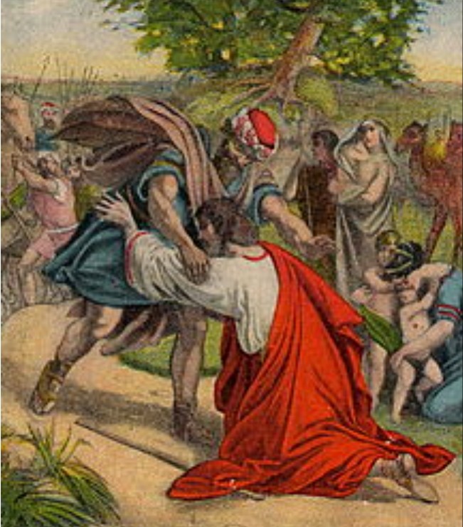 Perdona y serás perdonado, reconciliación de Jacob y Esaú en Génesis 33, ilustración de una tarjeta bíblica publicada por Julius Schnorr von Carolsfeld.
