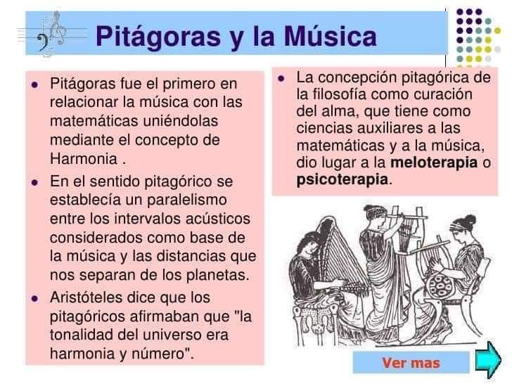Pitágoras fue el primero en relacionar la música y las matemáticas. Se centró en el estudio de la naturaleza de los sonidos musicales y descubrió que existía una relación entre los sonidos armónicos y los números enteros, creando con ello una teoría matemática de la música.