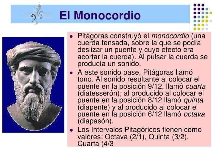 Pitágoras hizo famoso el monocordio. Un instrumento musical el cual estaba formado por una cuerda cuya longitud era proporcional a 12 y que podía adoptar diversas longitudes.