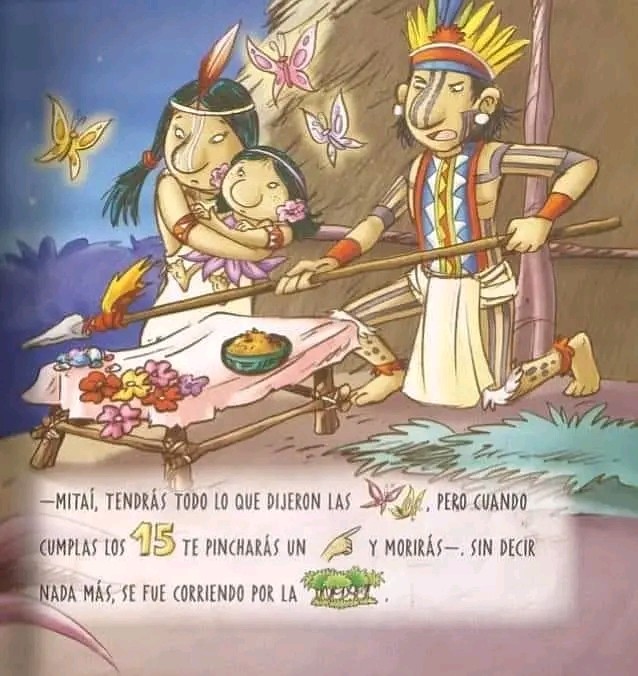 En esta adaptacion, la Bella Durmiente de Perrault es guaraní y, a través de las palabras y dibujos, nos cuenta su historia pero también la de su rica cultura.