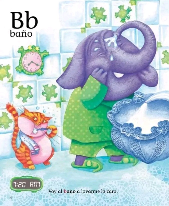 Un libro ilustrado del abecedario sobre las actividades diarias de un niño en el hogar y la escuela que también se puede usar para aprender y practicar cómo decir la hora.