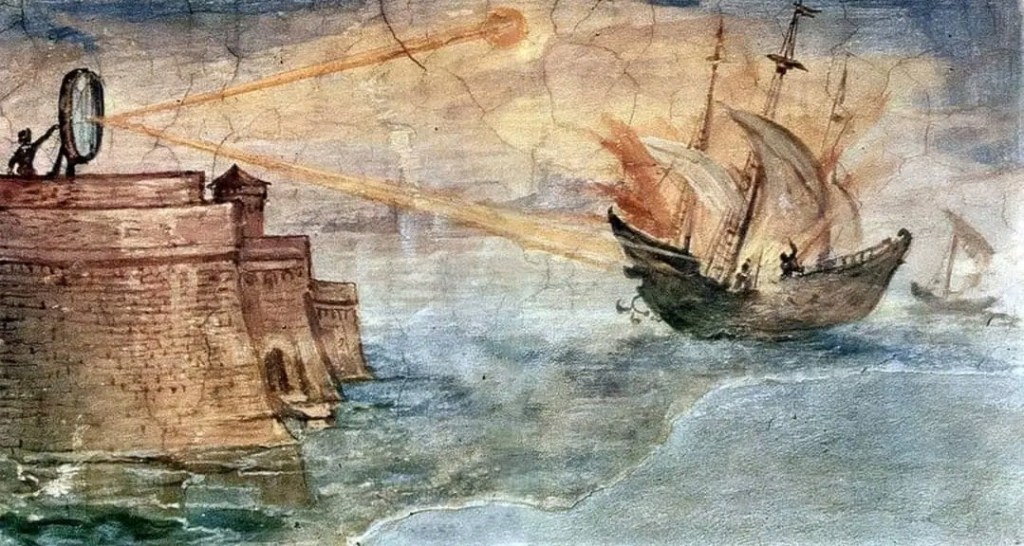 Arquímedes de Siracusa utilizó unas de sus «invenciones», los famosos «Espejos Ustorios», para incendiar las naves de guerra romanas que intentaban atacar a su ciudad.
