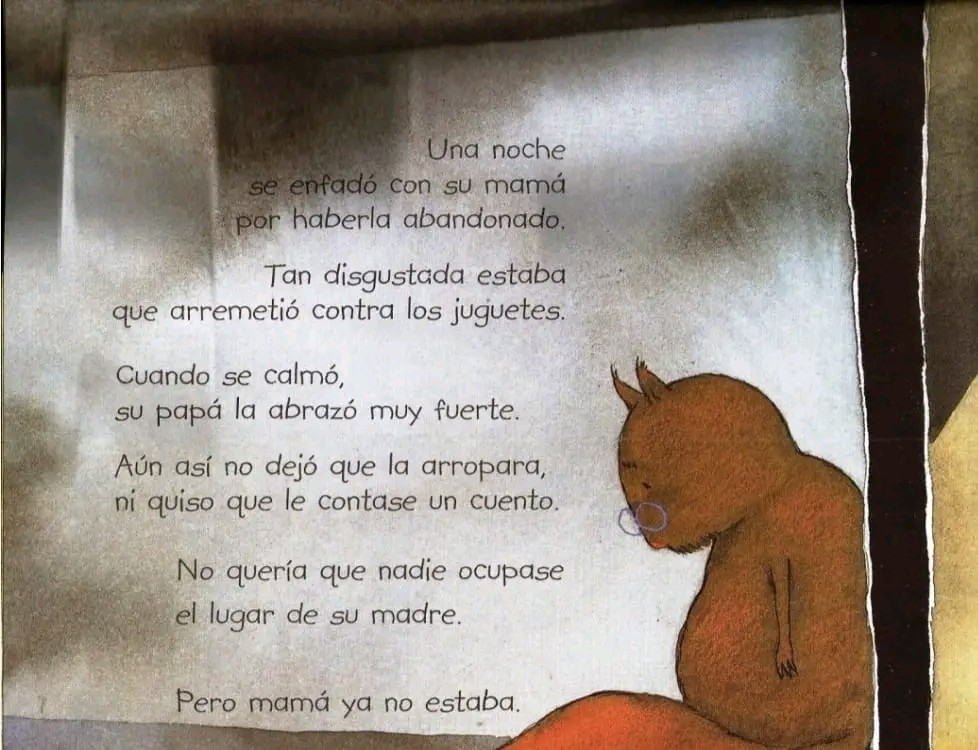 En el cuento de Rosa Osuna, la protagonista de este trance es una ardilla roja que busca consuelo tras la muerte de su madre. Acompañada de dos personajes adultos, su padre y un búho, la ardilla experimentará las distintas etapas del duelo. Lo hará compartiendo emociones y sentimientos, especialmente con su padre, buscando ambos sanar las heridas que ha dejado la pérdida de su familiar querido.