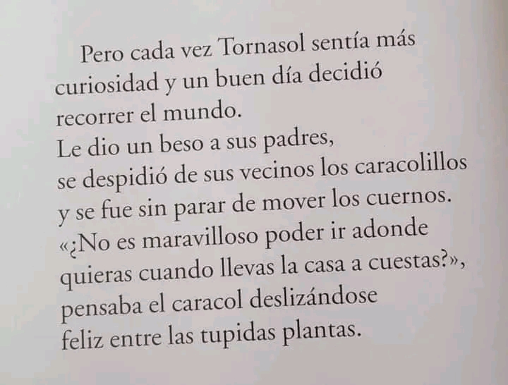 La familia caracol hacía mucho tiempo que vivía en el viejo jardín. Tornasol se preguntaba muchas veces hasta dónde llegaba el jardín y qué había más allá. A esta pregunta sus padres siempre respondían que en ningún lugar estaría tan bien como en casa. Pero la curiosidad de Tornasol crecía cada día más y un buen día decidió recorrer el mundo.