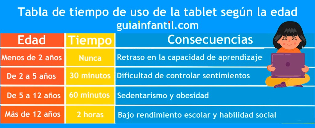 Máximo 1 hora al día, más tiempo favorece el sedentarismo y la obesidad. El control parental debe ser exhaustivo, y nunca debemos dejarles estar solos con las pantallas en su dormitorio, y mucho menos tener ordenadores, tablets o televisores en él.