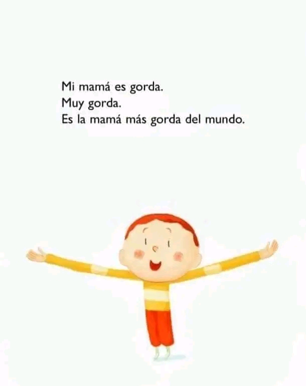 La mamá de un alegre pequeño es gorda. Muy gorda. Es la mamá más gorda del mundo. Cuando ella se ríe lo hace con todo su cuerpo: ¡es un temblor de risa! Algunos niños la señalaban y dicen a sus mamás: "Mira qué gorda está esa señora". Eso lo hace sentirse orgulloso, pues su mamá es la más bella del mundo.
